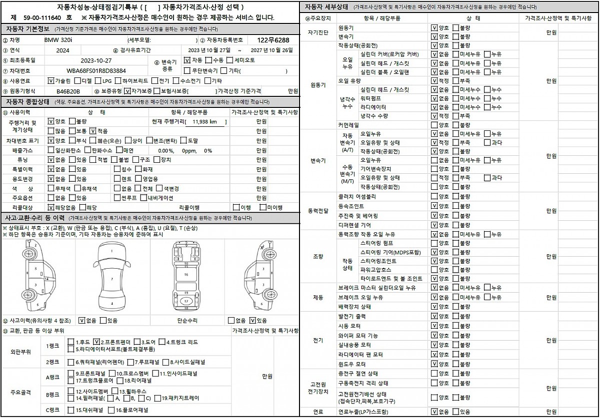 무사고: 단순수리 X 보험이력 O (전범퍼, (우)전휀더 교환)
